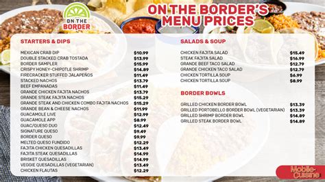 Web web on the border menu and prices on the border menu prices. Big nacho chips topped with refried beans, seasoned ground beef, mixed cheese and our signature queso. From salsa and guacamole made fresh daily.